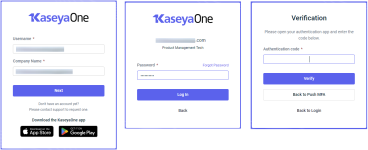 NOTE Push multi-factor authentication (MFA) is also available for Unified Login. After you set up push MFA for your KaseyaOne account, it will be the default method used to verify your identity when accessing your KaseyaOne account. Two-factor authentication (2FA) will continue to be available as usual. Refer to Set up push multi-factor authentication for Unified Login.