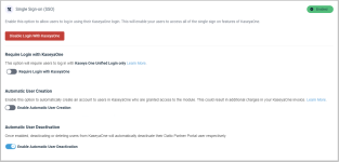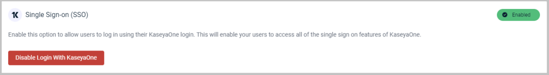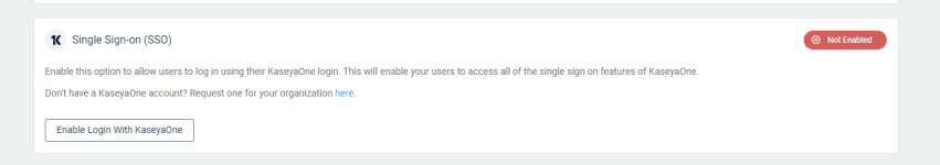 Go to the Single Sign-on (SSO) section of the page that shows the KaseyaOne logo and click Enable Login with KaseyaOne.