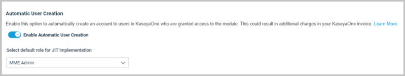 Configure Automatic User Provisioning for Datto Partner Portal as follows to allow just-in-time user provisioning for the module where module user accounts will be created automatically, with a specified default role, whenever new KaseyaOne users are granted access to Datto Partner Portal.