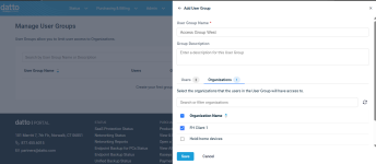 Use the dropdown option on the left to set the default Organization Access level for all products except Datto Endpoint Backup. Use the dropdown option on the right to set access level for Datto Endpoint Backup.