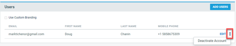 2. On the Users card, click the options icon next to the employee you wish to deactivate, then click Deactivate Account from the drop-down menu.