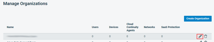 To manage users, networks, or devices for the organization, click Edit (the pencil icon) next to the organization. To delete the organization, click Delete (the trash can icon).