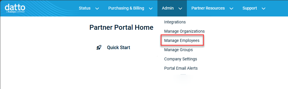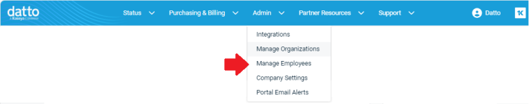 In the Datto Partner Portal, navigate to Admin > Manage Employees.